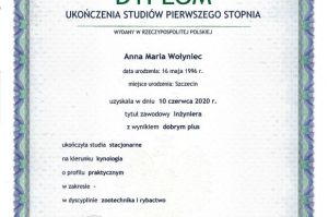 "W 2016 roku zaczęłam w pełni oficjalnie przygodę z kynologią, rozpoczynając studia. W trakcie ich trwania odbywałam praktyki w salonie groomerskim, w Związku Kynologicznym w Polsce z oddziałem w Szczecinie, jak również w hodowli dla psów, szkole dla psów i gabinecie weterynaryjnym. Cały czas nieprzerwanie moje życie kręci się wokół tychże czworonogów - pierwsze kroki stawiałam w sklepie zoologicznym (tam dbaliśmy o to, aby dobrać karmę o jak najlepszym składzie i o odpowiedni dobór akcesoriów spacerowych do zapotrzebowania psa i jego przewodnika). Następnie poświęciłam się weterynarii, w gabinecie miałam do czynienia już nie tylko z psami, ale z całą gamą gatunków małych zwierząt towarzyszących i egzotycznych.