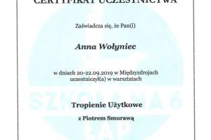 w latach 2019-2020 kilkukrotny udział w seminariach tropienia użytkowego z Piotrem Smurawą, Akademia Psa Pracującego