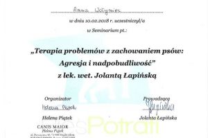 Seminarium "Terapia problemów z zachowaniem psów: agresja i nadpobudliwość", lek. wet. Jolanta Łapińska, 2018 (jako uczestnik i organizator)