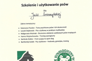 Julia ukończyła studia pierwszego stopnia na kierunku Kynologia na Zachodniopomorskim Uniwersytecie Technologicznym w Szczecinie, na swoim koncie ma rownież szereg kursów doszkalających takich jak kurs dogoterapii, kurs pierwszej pomocy przedweterynaryjnej dla psów, szereg warsztatów o tematyce kynologicznej. Odbyła staż w dwóch szczecińskich szkołach dla psów i pracowała w gabinecie weterynaryjnym.